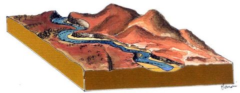 | meandri | SINUOSITA' CAUSATE DALL'AZIONE EROSIVA CHE RENDONO SERPEGGIANTE IL PERCORSO DEL FIUME IN PIANURA. |