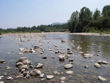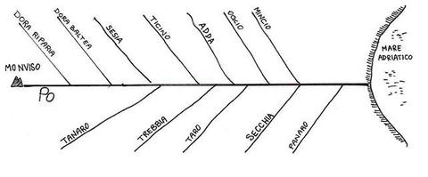 Per es. gli affluenti del Po incominciando da sinistra sono: la Dora Riparia, la Dora Baltea, la Sesia, il Ticino, l'Adda, l'Oglio e il Mincio. Quelli di destra sono: il Tanaro, il Trebbia, il Taro, il Secchia e il Panaro. | |