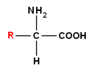 What bonds are responsible for the tertiary structure? | Hydrogen bonds between R groups, ionic bonds between COO- and NH3+ of R groups, disulphide bridges between cysteine groups and hydrophobic interactions (hydrophobic R groups cluster inside proteins to shield themselves from water) |