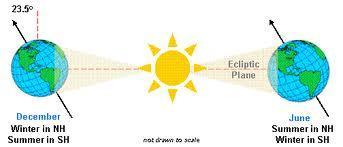 | How do the seasons occur? | The earth is tilted on it's axis and as it rotates around the sun each year the top and bottom end of the earth change from being close to the sun (summer) and further away from the sun (Winter) |