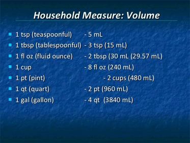 | Convert 2 oz, 3 oz, & 3 oz into mL? | Multiply the total ounces by 30mL/oz: 7.5 X 30mL= 225mL |