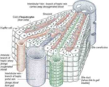 | What is the sinusoid and where is it? | The sinusoid is where the hepatic artery and hepatic portal vein meet in the lobule of the liver. It is lined with hepatocytes allowing close contact to the blood. Here the oxygenated and deoxygenated blood is mixed. |