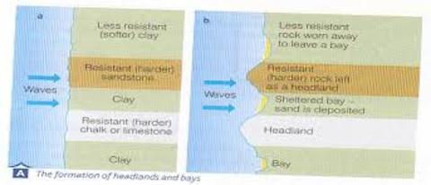 | headlands and bays form where erosion resistance is different |