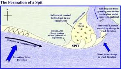 | spits: form at sharp bends in the coast - at river mouth LSD transports material past the bend and deposits it in the sea wind/waves curve end of spit |