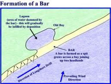 | bar: formed when a spit joins two headlands together cuts off bay from sea lagoon forms behind |