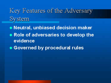 | Adversary System | The judicial system in which opposing parties present evidence, and an impartial judge or jury weighs the evidence; contrasts with the inquisitorial system, where the judge actively questions the accused and witnesses. |