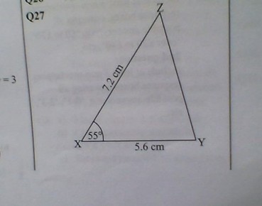 | Construct a triangle XYZ where XY=5.6 cm XZ=7.2 cm and angle YXZ= 55 |