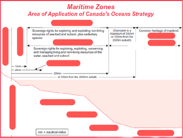 | Exclusive Economic Zone | 200 nautical miles from the baselines Within the EEZ, a coastal state has sovereign and jurisdictional rights over exploration and management and economic exploitation of living and non-living resources in the waters above the seabed, in the seabed and beneath the seabed. Canada’s EEZ has a surface area of approximately 2.9 million square kilometres. |