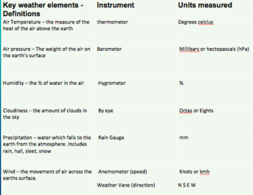 | What are the 6 elements of weather, what units are they measured and how are the elements measured (instruments) | |