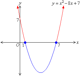 | Here is the graph of \(y=x^2-8x+7\). Use it to solve the quadratic inequality \(x^2-8x+7>0\) | \(x<1\) or \(x>7\) These are the red sections of the curve. Note - do not write \(x<1\) and \(x>7\) - the word 'and' implies \(x\) would need to be \(<1\) and \(>7\) at the same time... which is clearly not possible! |