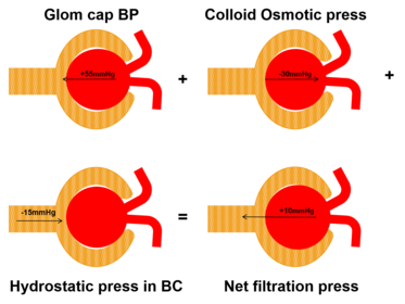 | What drives glomerular filtration? | 10 mmHg net pressure in the glomerulus |