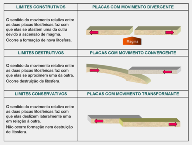 Limites de Placas: - Divergentes: Zona de Rífte/formação da crosta (falhas divergentes) -Convergentes: Zona da Fossa Oceânica/destruição da crosta (falhas convergentes) -Conservativos: Zona de Rifte (falhas transformantes) |