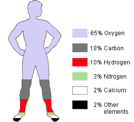 | The human body is made up of just 16 elements.However, 98.5% of the body is made up of just six. What are they? | Oxygen(65%) Carbon(18%) Hydrogen(10%) Nitrogen(3%) Calcium(1.5%) Phosophorus(1%) |