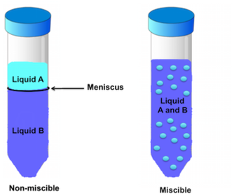 | What is the difference between miscible and immiscible? | Liquids that can be mixed are said to be miscible while liquids that don't mix are said to be immiscible. |