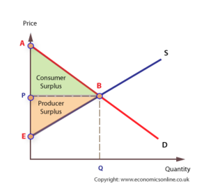 | How do you show consumer and producer surplus on a diagram? | Consumer surplus is below demand but above equilibrium and producer surplus is above the supply curve but below equilibrium |