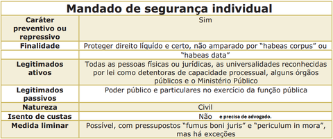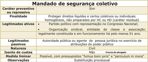 | Quem pode impetrar mandado de segurança coletivo? | a) partido político com representação no Congresso Nacional; b) organização sindical, entidade de classe ou associação legalmente constituída e em funcionamento há pelo menos um ano, em defesa dos interesses de seus membros ou associados. |