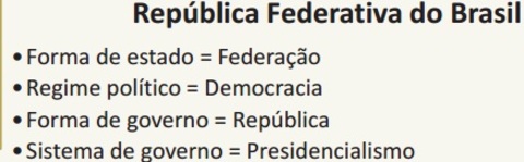 | Qual é a forma de estado, forma de governo , regime político e sistema de governo adotados no Brasil? |
