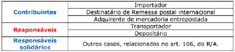 Sujeito Passivo Responsável ▼ • Transportador • Depositário • Qualquer pessoa que a lei designar | Sujeito Passivo Responsável Solidário ▼ • Ler Art 106 do R/A |
