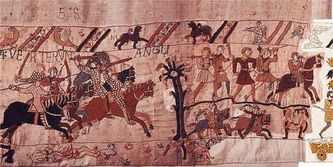 | 13 L'Arazzo di Bayeux. L’Arazzo di Bayeux, lungo oltre 70 metri, rappresenta la Battaglia di Hastings. Alla realizzazione di questo arazzo nel 1077 vi lavorò una vera e propria “squadra” di donne normanne che ricamarono a punto pieno e a punto croce la storia della conquista dell’Inghilterra. Questo dipinto è una delle fonti storiche più preziose riguardanti l'invasione normanna nell'isola britannica. Questo arazzo infatti descrive con grande accuratezza tutte le fasi dello scontro da quelle precedenti fino alla morte di Aroldo. | 14 |