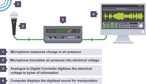 | Sound - Information | Sounds created on a computer exist as digital information encoded as audio files. Digital sound is broken down into thousands of samples per second. Each sound sample is stored as binary data. |