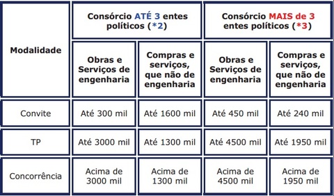 Quais os valores da modalidades de licitação quando se trata de consorcio público formado por até 3 entes da federação? e quando formado por mais de 3 entes? | |