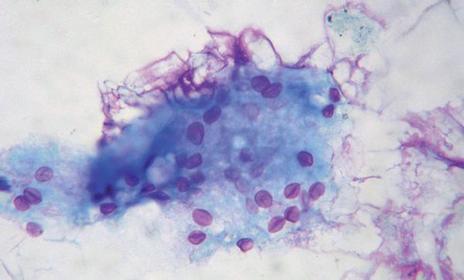 | PNEUMOCYSTIS JIROVECI Tsüstid Bronhiaalaspiraadi äigepreparaat, värvitud toluidiinsinisega | |