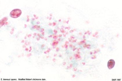 | ENTEROCYTOZOON BIENEUSI (Ph. Microsporidia) Spoorid Fekaaläie, modif trikroomvärving | |