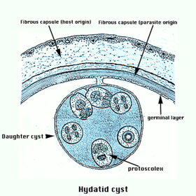 | ECHINOCOCCUS GRANULOSUS - ehhinokokk-paelussi vastsevorm Hüdatiidtsüst: tütarpõied ja haudekapslid protoskooleksitega Histoloogiline preparaat | |