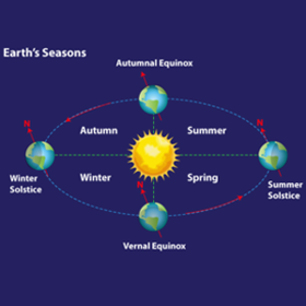 | Name all the equinoxes and solstices | Spring equinox- Around 21st March Autumn equinox- Around 23rd September Summer solstice- Around 21st June Winter solstice- 22nd December |