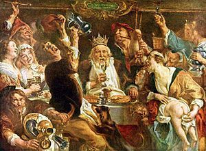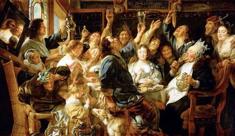 | JACOB JORDAENS "De koning drinkt", 1638 Barok, theatraal, invloed op het volkse. | |