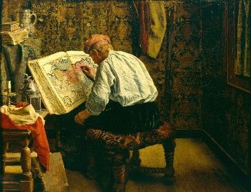 | HENRI DE BRAEKELEER "De Geograaf", 1871 Realisme : details, kleinburgerij, pause moment (// Vermeer), licht (// Vermeer) en warme kleuren (>< Vermeer). | |