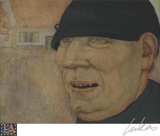 | GUSTAVE VAN DE WOESTYNE "Boer (Het antwoord)", 1911 Eerste Latemse groep : expressionisme, herinnert aan Van Eyck (Kanunnik Van der Paele) --> Emotieloze ingetogenheid, nauwgezet portret. | |
