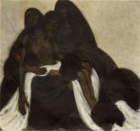| ALBERT SERVAES "Pieta", 1920 Eerste Latemse groep : symbolisme (religie) en expressionisme (subjectieve expressie), door deformatie van lichaam en clair-obscur. | |
