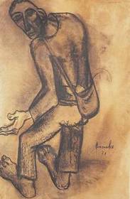 | CONSTANT PERMEKE "De Bedelaar", 1931 Tweede Latemse groep (expressionisten) : Expressionist, de essentie weergeven (wat betekent bedelaar zijn ?), vervorming vergroot expressie, synthetisch, stilering en geometrie, donkere aardkleuren (// grond). | |