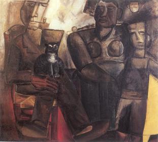 | CONSTANT PERMEKE "Boerengezin met kat", 1928 Tweede Latemse groep (expr.) : Geen echt decor, lyrische ruimte, monumentaal, invloed van kubisme en negritude, synthese van eenvoudig buitenleven. | |