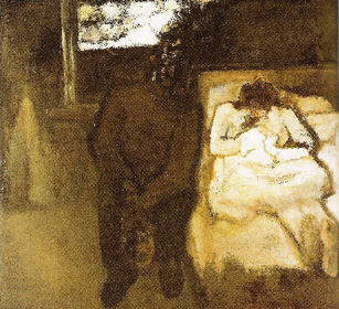 | CONSTANT PERMEKE "Het Afscheid", 1948 Tweede Latemse groep (expr.) : donkere man (Permeke) >< Lichte, dode vrouw (zijn vrouw), nog leven buiten, eenvoudig decor. | |
