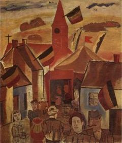 | GUSTAVE DE SMET "Dorpskermis", 1933 Tweede Latemse groep (expr.) : Vlaamse thema in universeler context, constructivistische compositie (geometrie), wat intimistisch en ingehouden. | |
