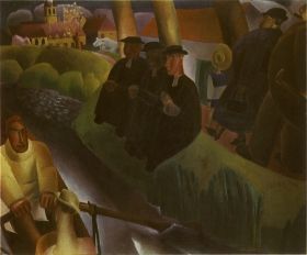 | FRITS VAN DEN BERGHE "Zondag aan de Leie", 1924 Tweede Latemse groep (expr.) : Invloed van kubisme, eenvoudige structuur --> Soort klassieke evenwicht, expressiviteit van lineaire opbouw en kleuren, dorpsleven verbondenheid. | |