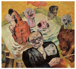 | JAMES ENSOR "De Intrige", 1890 Tweede fase (moderne) : Kritiek op burgerij (dom, enggeestig), ook angst en onzekerheid uitdrukken, dood aanwezig, visionair, fantastisch, lichtere kleuren, de mens in nietig (// Bosch en Brueghel). | |