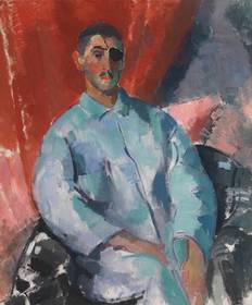 | RIK WOUTERS "Rik met de zwarte ooglap (zelfportret)", 1915 Brabantse Fauvisme : Felle kleurencontrasten, onrealistische kleuren, enigszins gedeformeerd. | |