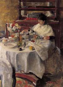 | JAMES ENSOR "De Oestereetster", 1882 Eerste fase (impress.) : licht en kleur van belang, burgerlijk interieur, donker koloriet. | |