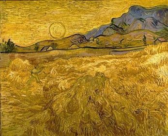 | VINCENT VAN GOGH "Korenveld met maaier en zon (Tarweveld achter het Hôpital Saint-Paul), 1889 Zuid-Franse periode : Natuur = individuele zingeving, mensheid = koren dat gemaaid wordt --> Memento mori, felle kleuren. | |