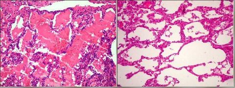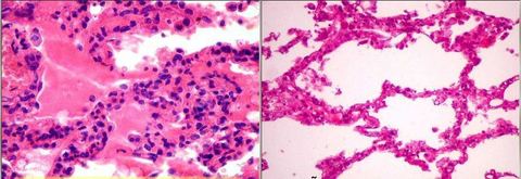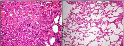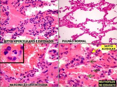 Broncopneumonia: comparação entre o septo com broncopneumonia e o normal. O septo patilógico apresenta-se mais espessado e com hipercelularidade (neutrófilos) e preenchido por exsudato | |