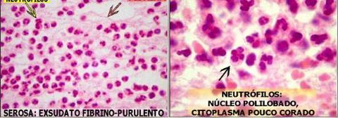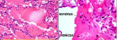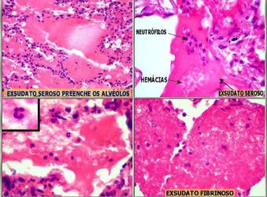 Broncopneumonia: Exsudato com presença de neutrófilos e hemácias. Exsudato seroso e fibrinoso | |