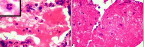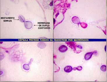 Fungos encapsulados acima e macrófagos abaixo na Criptococose cerebral | |