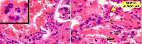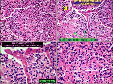 Pneumonia lobar: inflamação aguda fibrinopurulenta Amarelo: septos necróticos. e presença de piócito (neutrófilo degenerado) que compõe o exsudato fibrino purulento | |