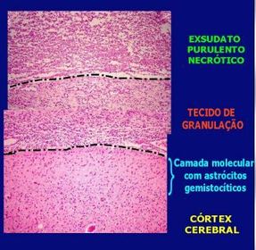 Meningite purulenta em organização - tecido de granulação- infiltrado inflamatório | |