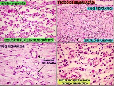 NO TECIDO DE GRANULAÇÃO: CÉLULAS DA INFLAMAÇÃO CRÔNICA INESPECÍFICA na Meningite Purulenta | |