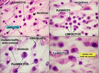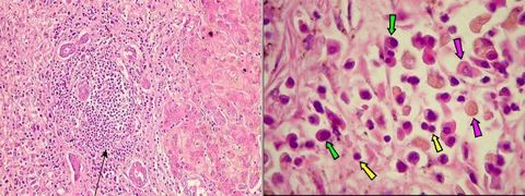 Hepatite aguda viral: na primeira lâmina observamos um um infiltrado inflamatório que é destacado na segunda. Seta verde: plasmócito; seta amarela: linfócito e seta rosa: macrófagos | |