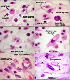 1- Células epítelióides (macrófagos modificados); 2- Células gigantes de corpo estranho (formada pela união de macrófagos[células epitelióides]) | |